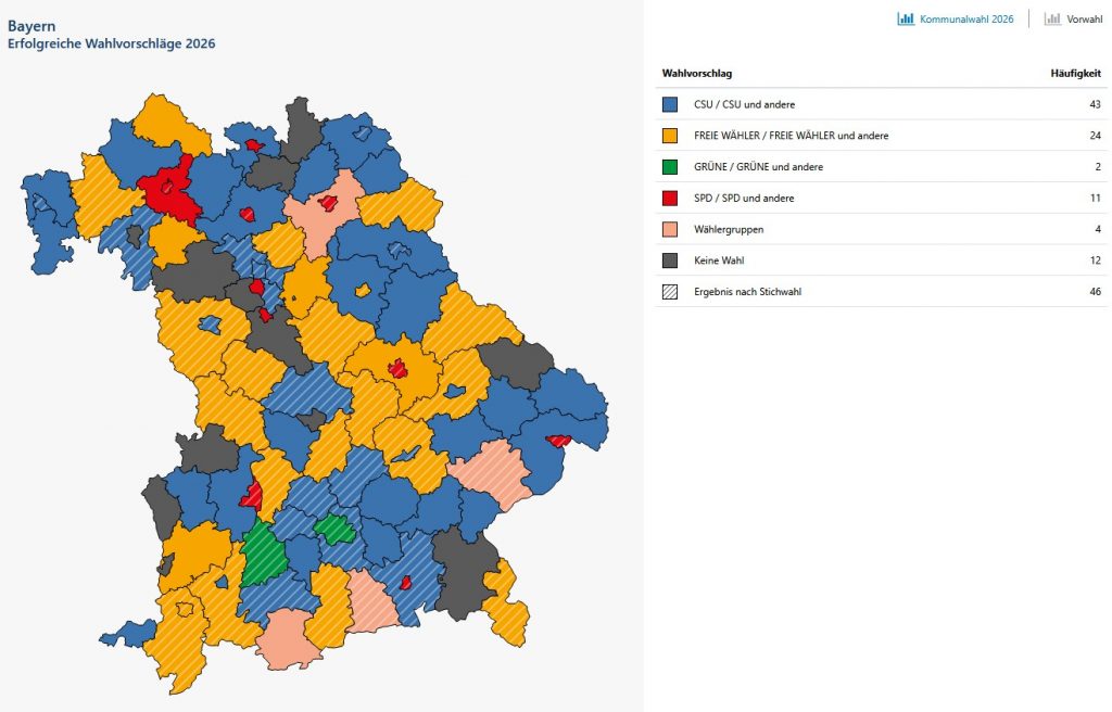 Über ganz Bayern gesehen hat die CSU 12 Landräte verloren, 11 an die FREIEN WÄHLER und einen an die GRÜNEN. Hauptgewinner sind die FREIEN WÄHLER (in der Grafik unten Orange), die jetzt 24 Landräte stellen (unterstützt zum Teil durch andere Gruppierungen), das sind 13 mehr als vorher, während die CSU jetzt nur noch auf 40 Landräte kommt. Die Grünen haben jetzt eine Landrätin, die SPD zwei. Wählergruppen (in der Grafik rosa) stellen vier Landräte, wobei diese stark mit den FREIEN Wählern assoziiert sind. Bei den Oberbürgermeistern gibt es folgendes Bild: CSU zehn (minus eins); SPD zwölf (minus eins), FREIE WÄHLER zwei (Plus zwei), Grüne einer (plus eins) – dieser aber in der größen Stadt: München (zitiert nach dem Text unter der Abbildung unten aus: MM, Bayern & Region , Ausgabe 24.3.2026: „Söder schimpft über Fehler vor Ort“).
